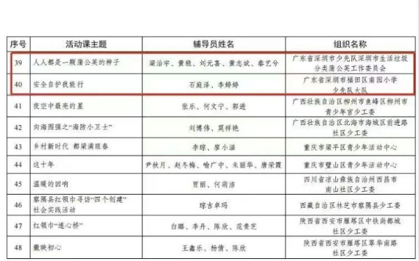近日,全国少工委办公室正式公布了《2022年度全国优质校外少先队活动课名单》,全国共有50节校外少先队活动课获此殊荣。其中,由广东省深圳市少先队深圳市生活垃圾分类蒲公英工作委员会推报的《人人都是一颗蒲公英的种子》光荣入选!