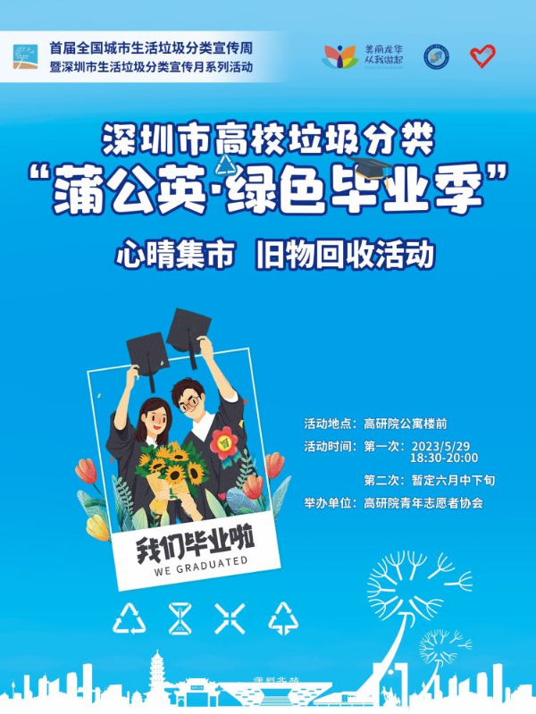 烂漫五月,又一年高校毕业季来临。借助深圳市生活垃圾分类宣传月契机,倡导简约适度、绿色低碳生活,为垃圾分类和环境保护营造良好的社会氛围,进一步激励全社会广泛参与垃圾分类,5月29日,龙华区城市管理和综合执法局联合电子科技大学(深圳)高等研究院举办了“蒲公英·绿色毕业季电子科技大学(深圳)高等研究院心晴集市”活动,通过开展毕业季可回收物校园回收宣传、毕业季“跳蚤市场”创意集市、毕业季校园爱心义卖等活动,实现毕业季生活垃圾大减量。