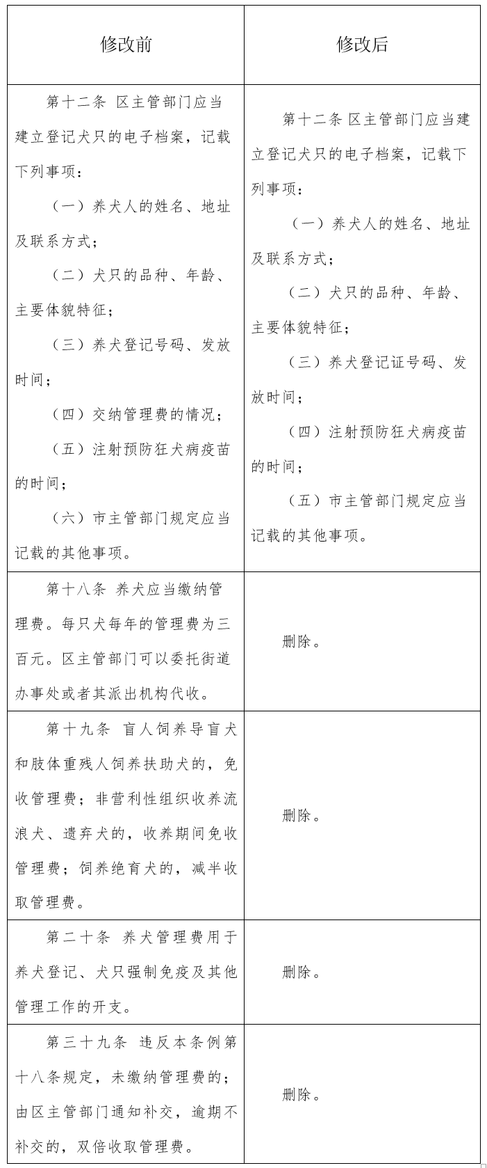 深圳市第六届人民代表大会常务委员会第二十六次会议审议了深圳市人民政府提出的《深圳市养犬管理条例》修正案(草案),经广东省第十三届人民代表大会常务委员会第五次会议批准,决定对《深圳市养犬管理条例》中与“放管服”改革要求不相适应的条款作如下修改: