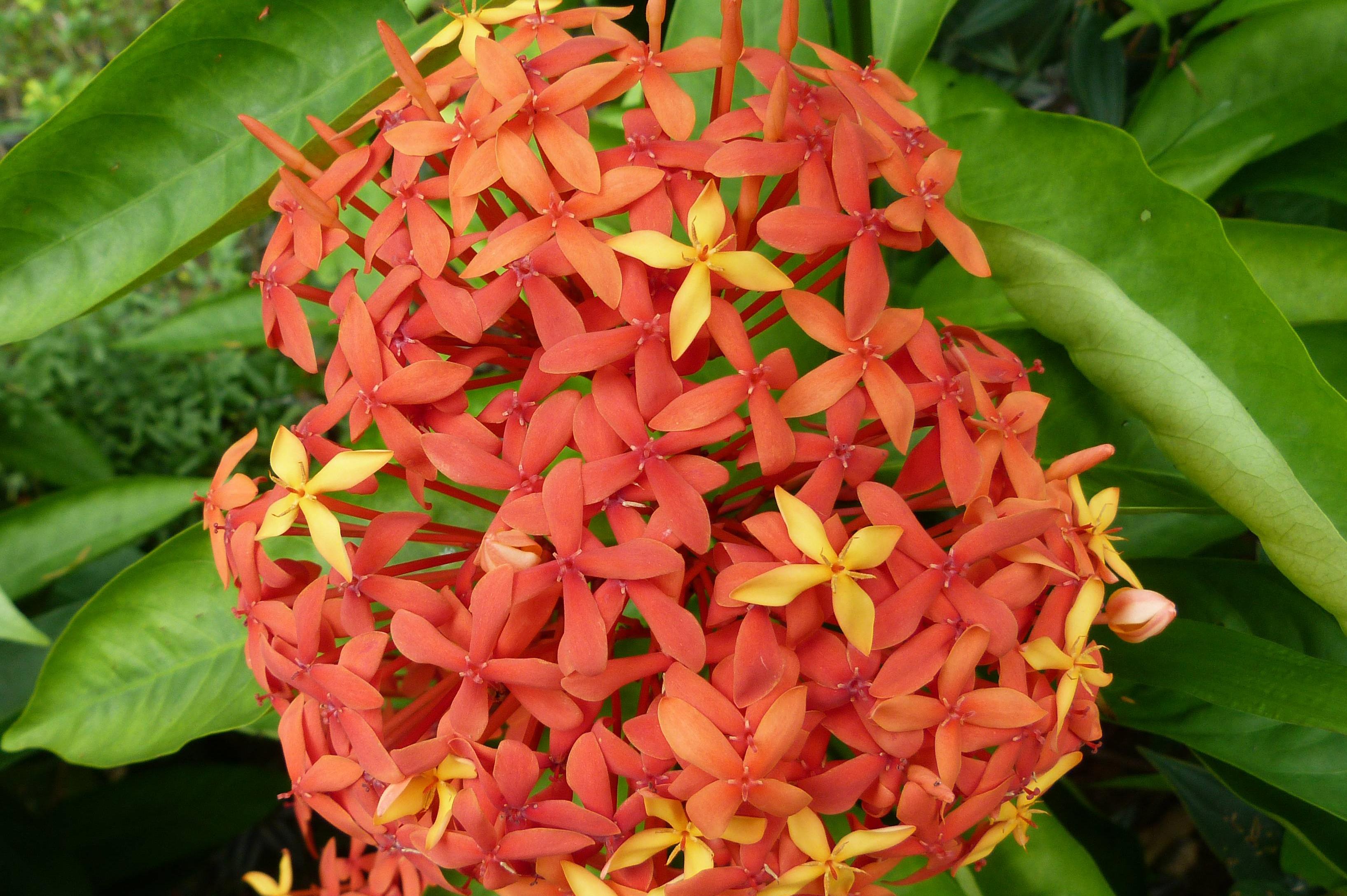 聚伞花序顶生,绣球状;花高脚蝶形,4裂;常见花色有红、黄、洋红等。