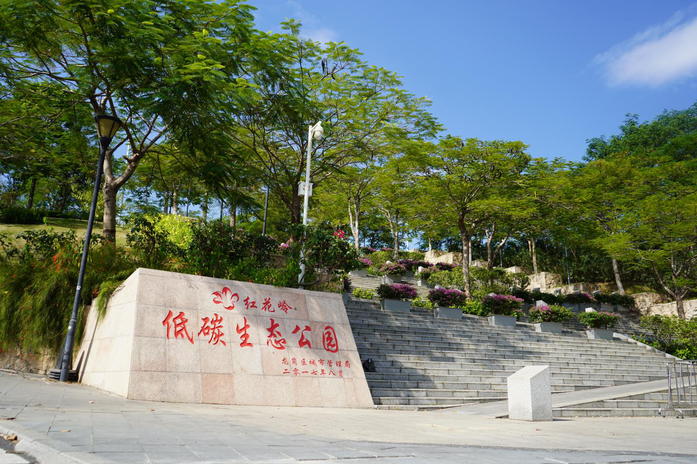 红花岭低碳生态公园占地面积65万平方米,位于深圳市龙岗区龙岗、龙城和坪地三个街道的交界处,龙岗中心城东北部,北侧紧邻红花岭采石场,东南侧紧邻龙环大道。由新生水库、田祖上水库及周边陆域组成。公园以自然山林景观为主,全园设有红花广场、环湖绿道、临翠登山道、观景塔、山韵广场、听风台、观谷台、栖霞廊、花溪童趣、低碳生态郊野径、红花岭自然教育中心、翠微径第四段、静远营地、翠微驿站、临翠山驿站、环翠山驿站,其中主入口停车场有150余辆停车位。游客服务中心1个,景观塔1座。公园设计中利用LID低影响开发技术,实现城市雨水收集利用的生态技术体系,贯彻生态环保的海绵城市的建设理念。
