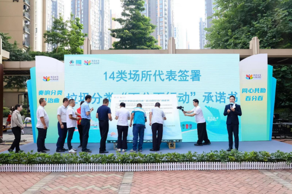 14类场所代表签署垃圾分类“百分百行动”承诺书。