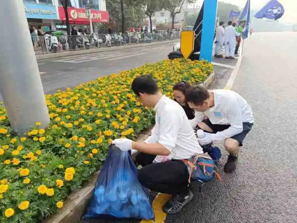 “志愿红”也成了“宝马”赛事中一抹靓丽的风景线,他们用实际行动诠释、弘扬“奉献、友爱、互助、进步”的志愿精神,助力垃圾分类。由60名蒲公英志愿讲师组成的垃圾分类志愿者团队前来助力,其中,40名志愿者在起终点引导跑者将各种垃圾正确分类投放、捡拾丢弃的垃圾并进行分类,同时在20个补给点处也各安排1名志愿者,对现场清理垃圾的环卫工人进行分类指导。