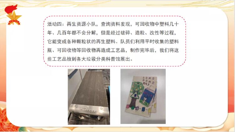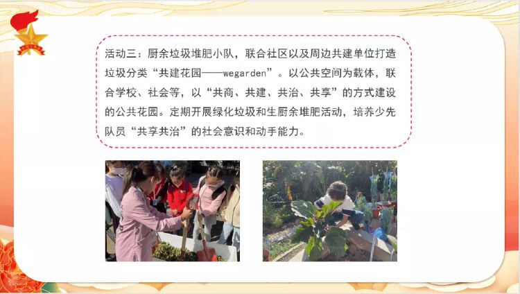 关键点4:聚焦培养共产主义接班人,带领少先队员在实践教育活动中砥砺品格、增长本领,实现德智体美劳全面发展,践行垃圾分类“新时尚”。
