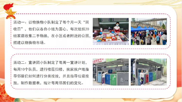 将队员们分为:以物易物小队、宣讲团小队、厨余垃圾堆肥小队、再生资源小队。