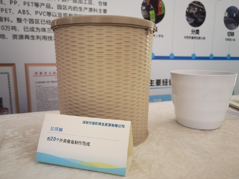 活动现场还有绿环、慈济、物与再生、恒和等企业展位,展示了众多外卖餐盒回收后再生材料制作的文创产品。