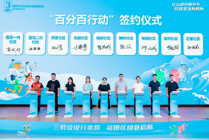 三载垃圾分类路,福田区绿色启航。为进一步推广垃圾分类理念、提高市民垃圾分类意识、加强垃圾分类处理能力,9月27日下午,福田区《深圳市生活垃圾分类管理条例》(以下称《条例》)三周年优秀代表表彰仪式暨“百分百行动”签约仪式在深圳书城中心城举办,活动由深圳市福田区城市管理和综合执法局主办,深圳报业集团深圳晚报社承办。
