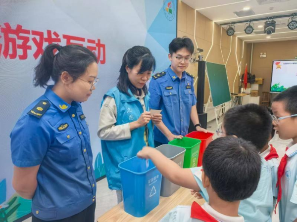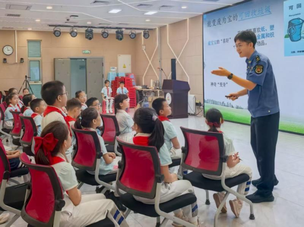 随着中小学开学季的到来,如何让环保教育成为新学期的“重要一课”?海淀街道综合行政执法队提前与学校沟通策划,创新普法形式,将严肃的执法普法转化为生动的“绿色冒险”活动。“今天我们要一起探索垃圾分类的奥秘,让城市更美丽!”执法人员借助PPT课件,向同学们系统讲解“两山”理念的深刻内涵、垃圾分类“四位伙伴”的具体分类标准,以及垃圾从投放、收集到处理的“奇妙旅程”,并用通俗易懂的语言传递环保理念。