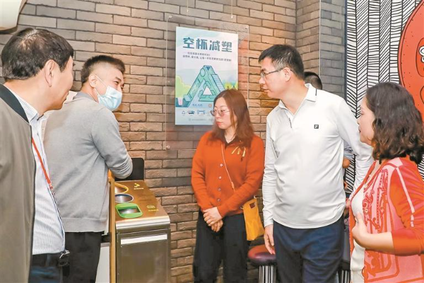 ▲与会代表在餐饮(茶饮)门店参观、调研蒲公英“空杯减塑”计划开展情况。