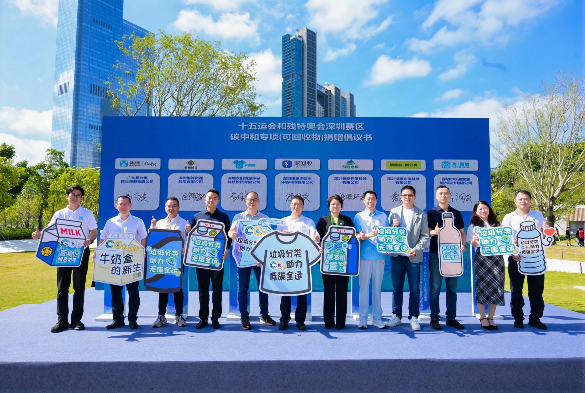 为将绿色成果直接赋能十五运会和残特奥会,活动特别设置碳减排量捐赠意向签约仪式。在深圳市生态环境局与深圳市城市管理和综合执法局的共同见证下,垃圾分类公益机构深圳市福田区零碳城市发展中心与十五运会和残特奥会深圳赛区执委会签订捐赠意向书,自愿捐赠奶盒回收行动中产生的碳减排量给赛事碳中和项目,让“企业践行责任、学生参与环保、共同助力‘无废全运’”的场景生动落地。