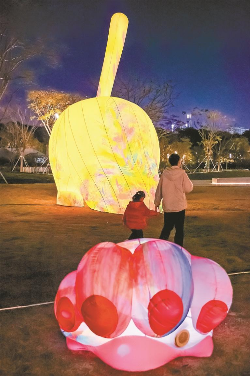 笔架山体育公园的夜间光影装置,可触发画面变化,吸引孩子们前来玩耍。
