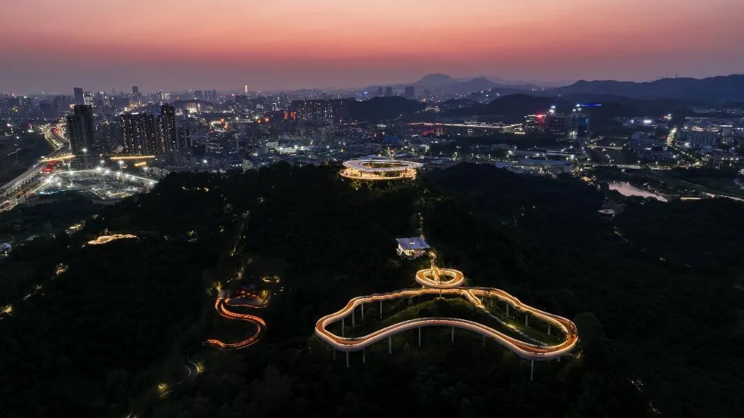 登上36.9米高的全景塔,这里是公园中心区域的至高点。360度无遮挡的视野,让你仿佛能触摸天际的圆月,俯瞰虹桥在月光下泛着金色暖光,碧眼水库波光粼粼。