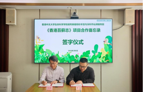 2026年2月6日,深圳市仙湖植物园与香港中文大学生命科学学院胡秀英植物标本馆合作签约仪式在仙湖植物园顺利举行。胡秀英植物标本馆馆长刘大伟博士与仙湖植物园主任罗栋博士代表双方签署合作协议,共同启动《香港苔藓志》编研项目。
