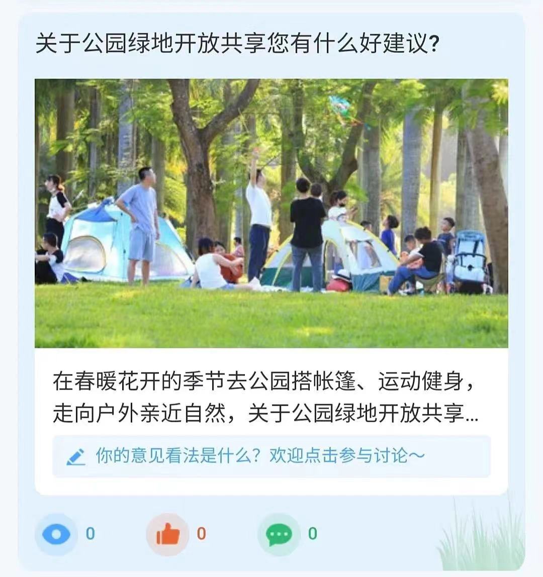 2022年10月,深圳市城市管理和综合执法局依托“i深圳”APP、“美丽深圳”微信公众号开发上线了“公园深圳”服务微门户。为进一步丰富服务内容,推动深圳公园“千园体检、万人问计”工作,“公园深圳”服务微门户上线“公园事大家议”功能,搭建公园与市民游客的互动交流平台,征询市民关于公园热点话题的看法建议,让市民声音成为公园建设发展道路上的“导航仪”,着力解决人民群众关注的问题。市民游客可以通过投票、发表看法等方式参与公园发展事项的互动,为公园深圳的建设发展建言献策,为美丽深圳贡献力量。届时,该功能板块下的“议事大厅”将在每期推出市民游客关注的热点话题,欢迎市民游客参与讨论。