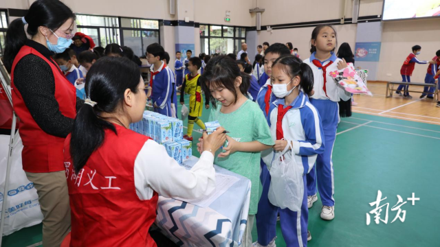 活动现场,兑换活动精彩纷呈,共吸引超千名学生参与,共发放礼品近两千份。主办方精心设置了知识讲解区、互动游戏区、奶盒积分区、奖品兑换区四个活动区域,学生积极参与,热情高涨,乐此不疲地穿梭其中。先到奶盒积分区按照“5奶盒=1积分”的标准兑换维他奶、绘本、挂件等礼品。知识讲解区和互动游戏区也排起长队,参与知识问答和游戏互动,同样有机会获得丰厚的礼品奖励。不少同学都兑换到心仪的礼品,小脸上满是兴奋与幸福。