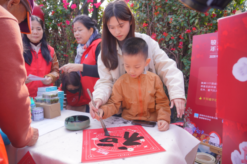 移步至“减量打卡区”,充满新春氛围的环保主题打卡墙吸引众人驻足拍照。市民将照片分享到社交平台,集齐指定数量的点赞即可获得即影即有照片一张,定格新春第一张环保全家福,还能解锁“低碳接福区”专属福利——由书法协会老师现场书写的“福”字春帖。市民张女士手持刚打印出的拍立得照片,排在队伍中等待领取春帖:“手写的福字才有年的味道,这比买来的更有意义。”