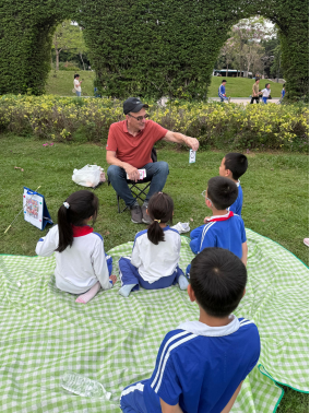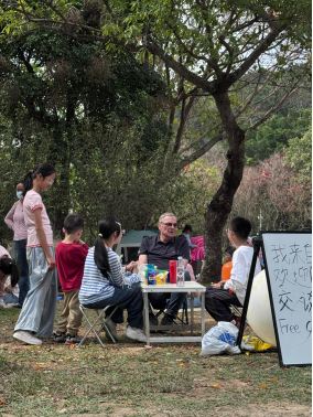 自今年3月起,丹尼尔固定每周日下午1点至6点,出现在深圳莲花山公园风筝广场的草地上开展英语角活动,与来往行人自在交流,至今已举办四期。