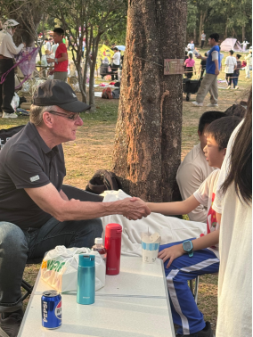4月12日傍晚,来自美国的丹尼尔(Daniel)坐在莲花山公园的树阴下,与市民进行英文交流。现场,有几位孩子主动上前用英语打招呼,虽发音略显生涩,但热情十足,现场氛围轻松而自然。