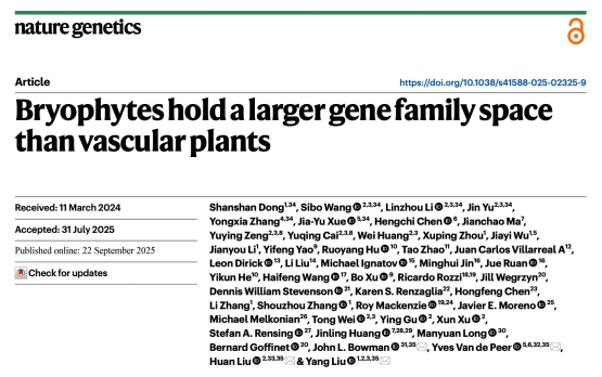 2025年9月22日,一项由深圳市中国科学院仙湖植物园(以下简称仙湖植物园)牵头,联合国内外多家单位共同完成的重磅研究,以“Bryophytes hold a larger gene family space than vascular plants”(苔藓植物基因组拥有比维管植物更丰富的基因家族)为题,发表于国际著名期刊《Nature Genetics》(自然-遗传学)上。研究结果首次系统地揭示了苔藓植物在基因家族层面拥有超越维管植物的多样性,颠覆了长期以来关于苔藓植物“原始、简单”的认知。