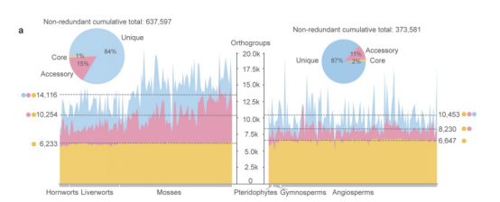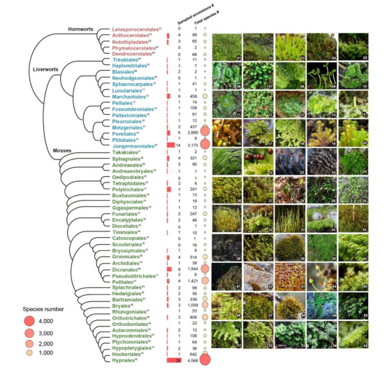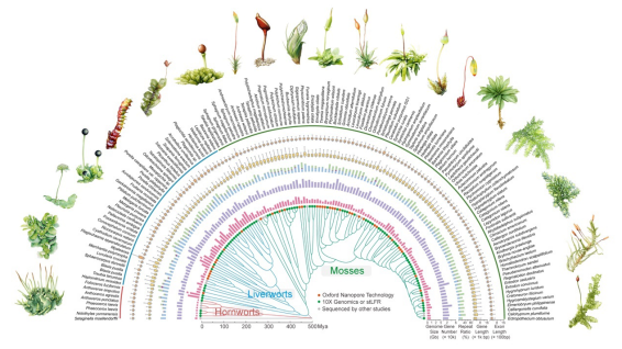 研究团队对123种苔藓植物(包括苔类、藓类和角苔类)的基因组进行了高质量测序(图1),构建了全球首个苔藓“超级泛基因组”平台(www.bryogenomes.org)(图2)。