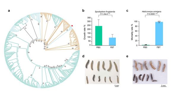 图6 a) 水平转移的FBT毒蛋白基因演化历史;b–e) FBT毒蛋白对草地贪夜蛾和棉铃虫的昆虫毒性实验结果