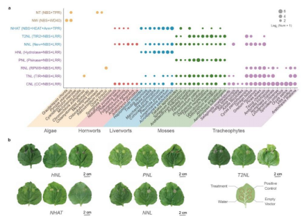 图7 a) 十类抗病基因受体在绿色植物中的分布;b) 五类抗病基因受体在烟草叶片中的超敏反应