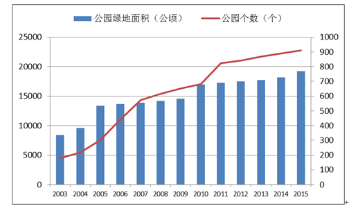 图1 2003-2015年深圳市公园绿地面积和公园个数
