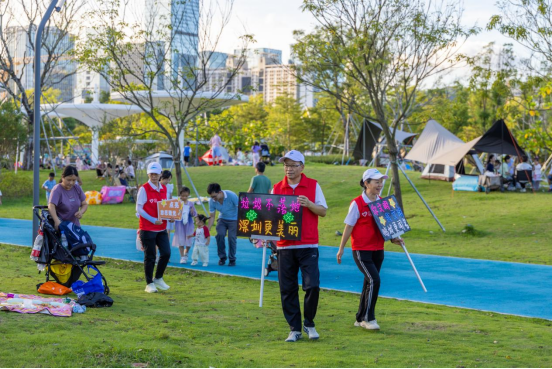 1.国庆中秋公园志愿服务。为营造干净整洁文明有序的游园环境,10月1日至8日,“美丽深圳”志愿者服务队组织超300名志愿者在莲花山公园、深圳湾公园、笔架山公园等重点区域,为两万多名市民游客提供文明引导和志愿服务。志愿者通过手持宣传牌、现场讲解等方式,向市民游客普及垃圾分类知识,倡导“我的垃圾我带走”的环保理念,共同营造和谐有序的游园环境。中秋节当晚,LED宣传屏的流光与志愿者的身影营造出浓厚的文明氛围。志愿者们用脚步丈量公园的每个角落,用微笑解答游客的每份困惑,持续传递“文明,是最美的风景”的理念,让“红马甲”成为国庆中秋长假期间最温暖的风景线。